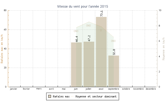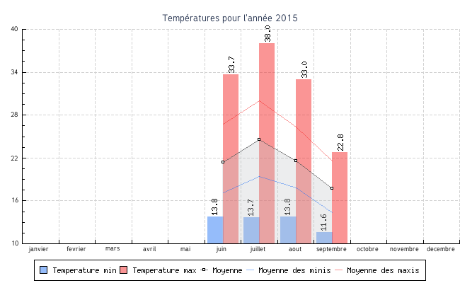 | juillet | 13.7 °C | 19.4 °C | 38.0 °C | 30.0 °C | 24.6 °C | 8.5 km/h | 47.2 km/h | ONO |